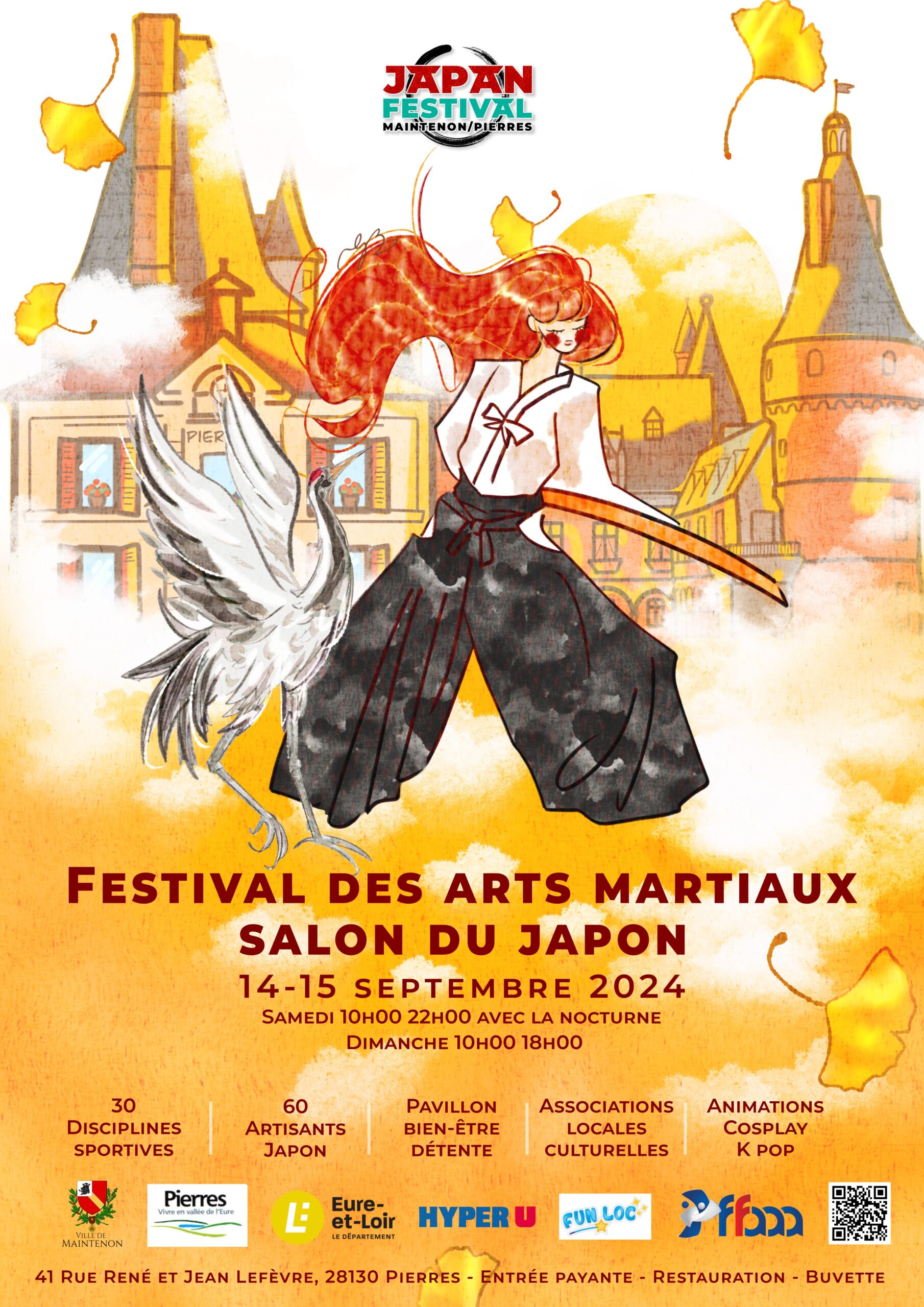 L’illustration de l’affiche s’intitule « Amitié au soleil levant ». J’ai imaginé une rencontre singulière entre une grue japonaise et une femme pratiquant l’Aïkido. Le corps tout entier de la femme est emporté dans le mouvement, de ses cheveux roux jusqu’au bout de son hakama, elle fait face au vent. Au moment où elle prend la pose, l’oiseau se dépose à ses côtés. Le soleil se lève sur le château de Maintenon et sur la mairie de Pierres, les feuilles dorées de Ginkgo virevoltent dans l’air. La grue apporte longévité et bonheur dans l’art de la femme au bokken.